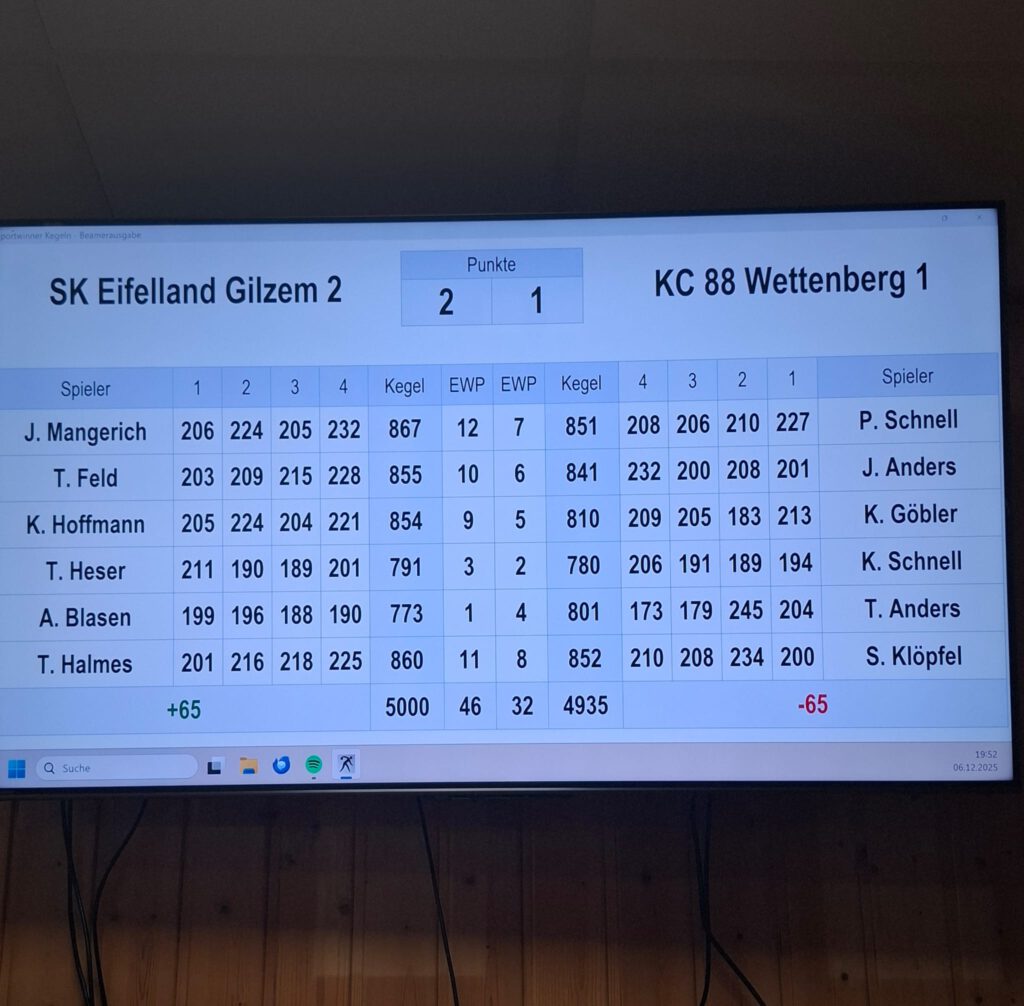 Im Schlussblock wurde es dann turbulent. Während bei den Hausherren Tom Halmes (860/11) ebenfalls nichts zuließ und sein Gegenspieler Sebastian Klöpfel (852/8) wie seine Mitspieler zuvor trotz ordentlichem Auftritt hauchdünn die starken Ergebnisse Gilzems verfehlte, galt der Blick den beiden übrigen Spielern. Gilzems Alain Blasen (773/1) gelang keine Bahn über 200 LP und er bescherte Wettenberg so ungewollt die fehlenden Wertungen für den Punktgewinn, der aber erst durch eine fulminante Aufholjagd von Wettenbergs Youngster Tino Anders (801/4) perfekt wurde: einer völlig desolaten ersten Halbzeit mit 352 LP mit einem „Blattschuss“ in die Räume lies er überragende 449 LP – davon 245 auf der Schlussbahn – folgen. Damit war der wohl eher glückliche Punktgewinn in trockenen Tüchern.
