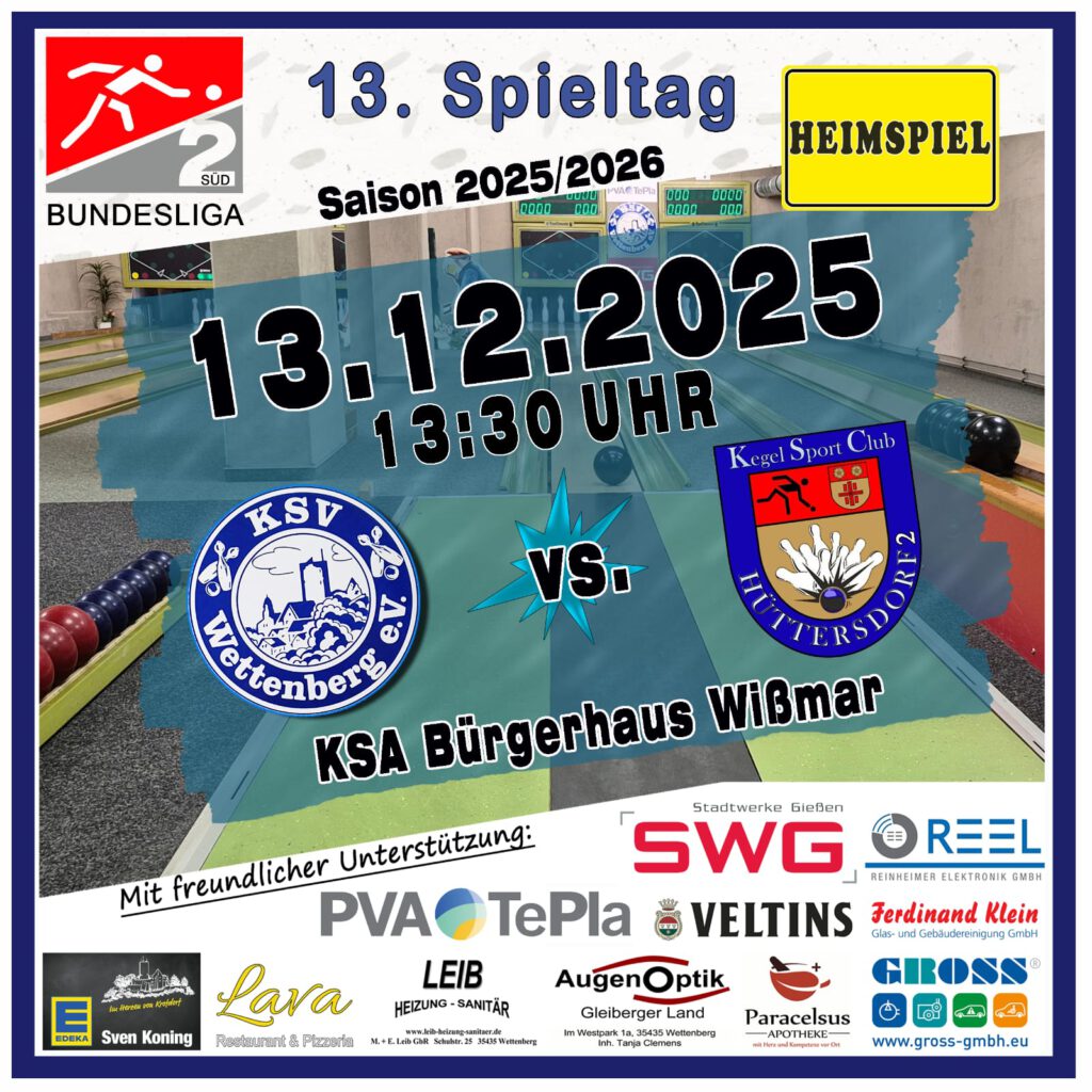 Das letzte Spiel des Jahres in der 2. Bundesliga Süd findet für den Tabellenführer KC 88 Wettenberg am dreizehnten Spieltag auf der heimischen Kegelsportanlage im Wißmarer Bürgerhaus gegen den Saarlandvertreter KSC Hüttersdorf II statt (Samstag 13:30 Uhr).