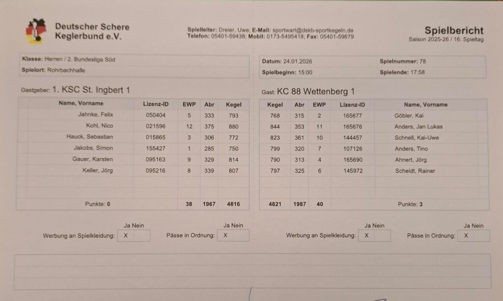 Obgleich der KC 88 auf Stammpersonal verzichten musste, zeigte sich das Team von Jörg Schnell auch beim bereits fünften Auswärtsspiel im Saarland konkurrenzfähig. Gastgeber St. Ingbert hatte im Startblock seinen mit Abstand stärksten Spieler Nico Kohl (880/12) platziert, der den Wettenbergern Jan Anders (844/11) und Kai Göbler (768/2) an der Seite von Felix Jahnke (793/5) mit seiner zweitbesten Saisonleistung das Leben schwer machte.
