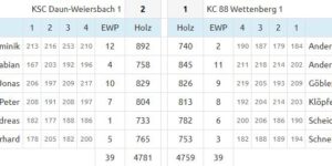 KSC Daun-Weiersbach – KC 88 Wettenberg 4781:4759 (2:1/39:39) Der KC 88 Wettenberg musste mit einer knappen Auswärtsniederlage beim KSC Daun-Weiersbach am achten Spieltag der 2. Bundesliga Süd die Heimreise antreten, …